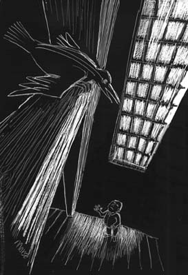 BIRD First came a fluttering in the gloom of the abandoned textile mill. Wings beating helplessly against dusty windows. Sunlight flared through pinholes in the roof where slates were broken. A few window-panes were missing. But the bird, I supposed, was confused or in3ured and unable to find its way back out. The carcasses of birds similarly trapped lay on the vast wooden floor, planks swollen in places where rain had leaked through. I followed the sounds, hoping to rescue the bird, thinking I might capture it or shoo it out through the rusty metal door that stood open behind me. It was not high on my priorities; still I don't like to see a poor dumb creature suffer needlessly. The mill had been abandoned for decades. I worked here in my youth, as a bobbin-winder. In those days the place hummed with the sound of spinning-machines. Then the whole textile industry moved south - first to the Carolinas, then to the Philippines, Bangladesh, Haiti; wherever labor was cheapest. It was a sad thing. Now I was drawn to the place out of a morbid fascination. We thought of it as a local problem, the town slipping into decline. But as I inspected the hulks of rusting machinery, I thought what a terrible commentary on all humanity it is that jobs are going to the places where life is cheapest and governments most corrupt. No sooner had I come to this realization than I heard the bird close at hand, fluttering helplessly against the wall. Exhausted. Probably disoriented. "There you are," I said, managing to trap it in my hands. My fingers encompassed it, pinned its wings to its struggling body. Drab bird. Starling, I thought. "Don't be afraid." "Afraid?" the bird cried. "Afraid?" Was this the normal call of a starling? I knew they weren't songbirds. But had this one been trained to mimic? "Don't be afraid," I repeated. "Afraid?" the bird persisted, struggling in my hand. "I'm fucking terrified!" Amazed, I dropped it. The bird landed on its feet and hopped some distance while I pursued it, my heart pounding. "I can't believe this," I muttered. "Believe! Believe! Just leave me alone." "I'm trying to help you!" Lunging with my foot, I managed to trap one of its wing-tips. "Help me? Jesus! You and what philanthropist?" Once again I nestled it in my palms as gently as I could. "I can help you escape," I crooned. But by now my scalp was creeping with recognition: either I was confusing the bird's random sounds for human speech, or I was holding onto something that could make me wealthy. "Jesus," I said, "I must be crazy." "Crazy!" the bird piped. "Crazy!" Darting its head around. "Do you know how many diseases birds carry?" Probably a trick, trying to make me let it go. Still, not wanting to inhale any of the crap from its feathers, I held my breath while it struggled. Finally it stopped. "How come you couldn't find your way out of this place," I demanded, "if you're so smart?" "Smart? I never said I was smart. I'm just a bird, man. Just a dumb creature! And if you guys are so brilliant, how come this place is abandoned?" "What's the connection?" The starling rolled its eyes and sighed. "Humans!" It stared at me furiously for a moment, then I could feel its wings shrug. It winced. "Humans! You just don't see the big picture." "What are you getting at?" "Look around you! What do you see? You humans have fouled your own nest! Screwed up your own social structure. Look at the air, look at the water! You've messed up everything!" All this was true. Still, I was annoyed hearing it from a bird. Not even an eagle or a kingfisher or something; just this dowdy little starling. "So what do we do?" I demanded, thinking I was condescending. "You're choking me. Loosen your grip, and I'll tell you." I loosened my grip. The bird ducked its head and croaked something inaudible. I bent closer to hear. Then it screeched so loudly that I let it go. With that it flew up to an oak beam, where it paced back and forth - regaining its strength, exercising its wings - looking down at me contemptuously. "Fly away!" it cackled. "Fly away!" I have always considered myself a nature lover, but now I was taken over by cold fury. I still have a pretty good throwing- arm; I picked up a half-brick - slowly, so as not to arouse suspicion - and took aim. But the starling swooped out the open door. "Fly away!" it taunted me, safely outside. "Fly away! Fly to the moon! Mess that up! Use up the water! Fly to Mars! Mess that up!" The bird flew out of sight. Its last words, delivered over its shoulder, were barely audible. "You old geezer!" ![]()