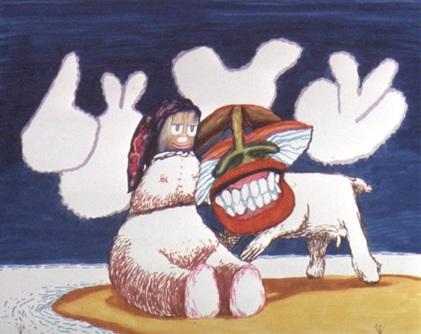 Grinning Dog with "Raggedy Ann" Doll, Clouds with Ears in Sky